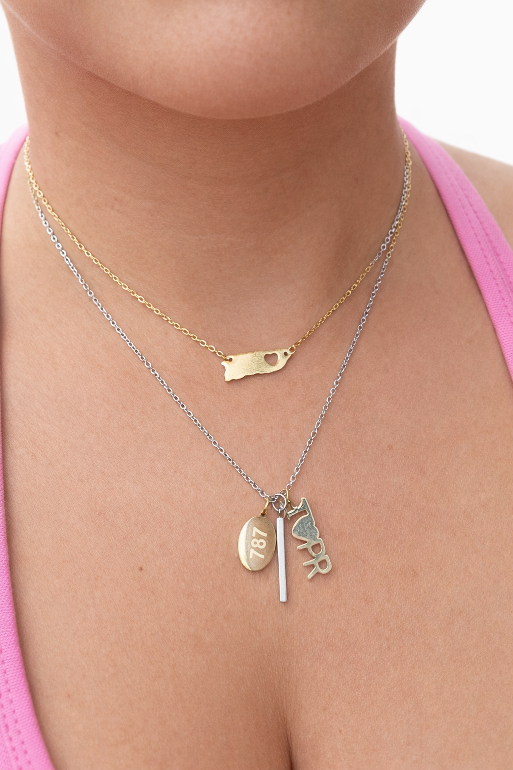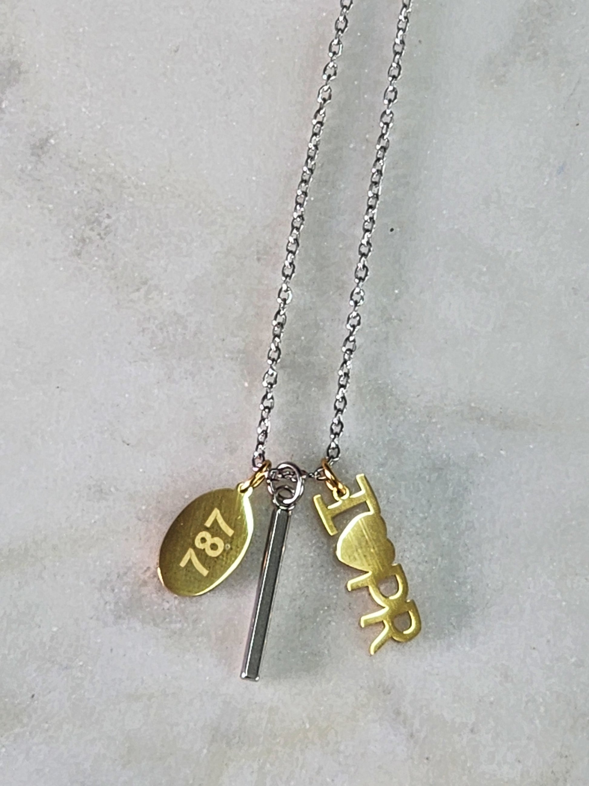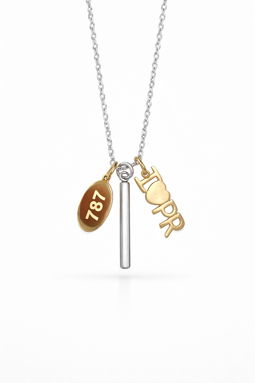 Cadena en stainless steel. Con pendientes que dicen I love PR y 787.